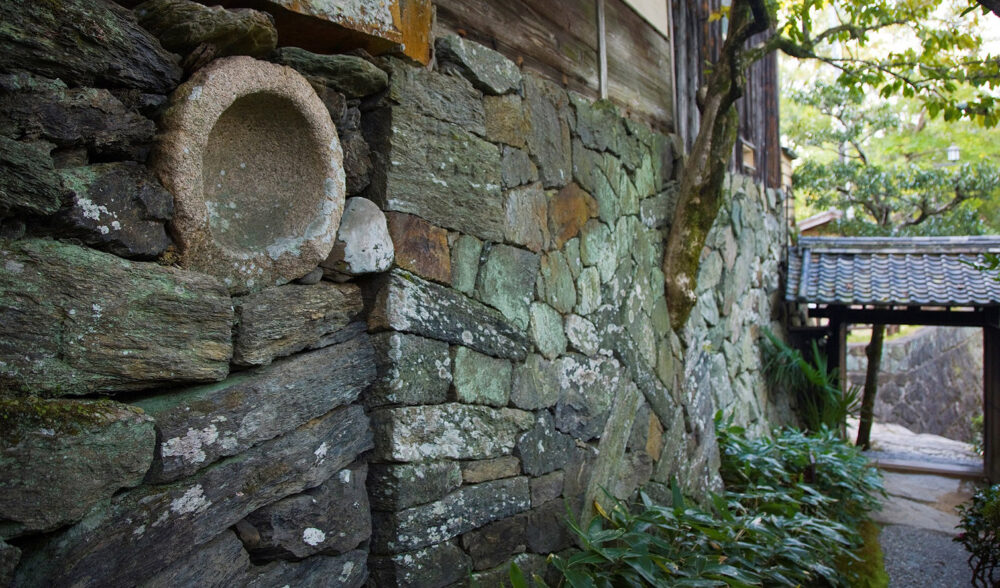 流れ積みでは、全体に積まれている横長の石は肱川の流れを、窪んだ横長の手水鉢は肱川に浮かぶ船を、臼石は夜空に浮かび上がる月をそれぞれ表現しています。