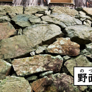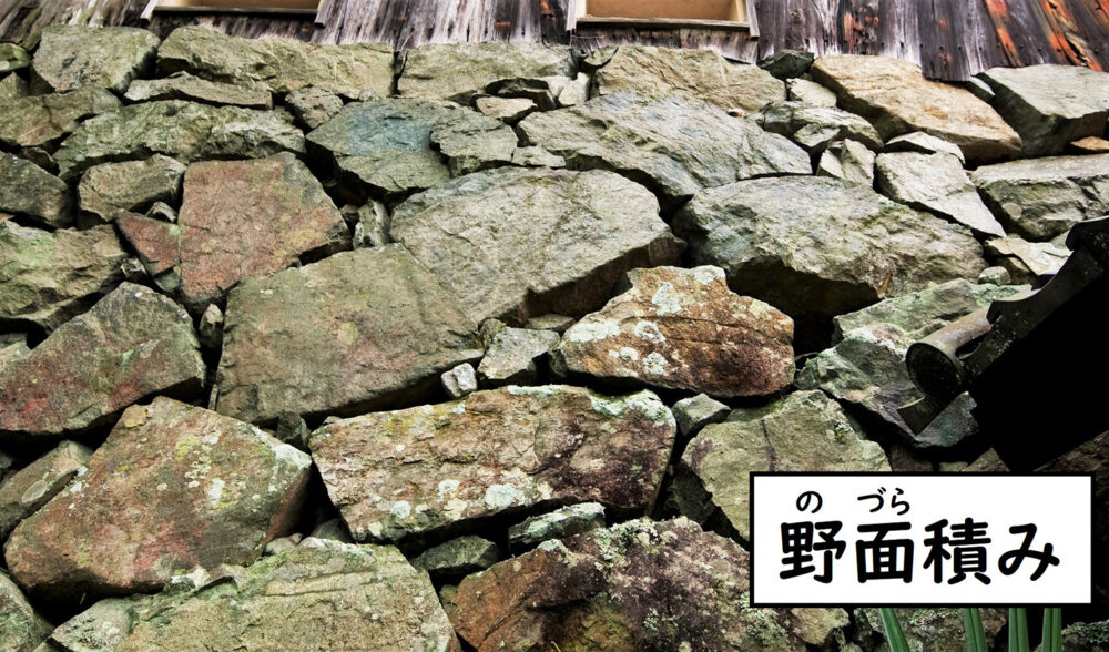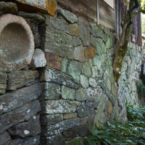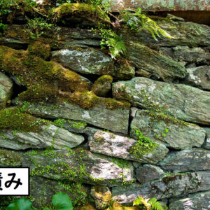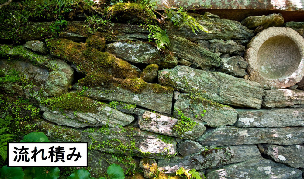 臥龍山荘の入り口付近には、多彩な積み方の石積みがあります。加工せず自然の形の石を大小混ぜるように積んだ野面積みをはじめ、石垣の裾を広げて積んだ末広積み、石垣の中に細長い石を横に並べて積んだ流れ積みを見ることができます。