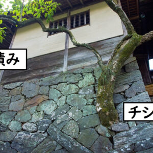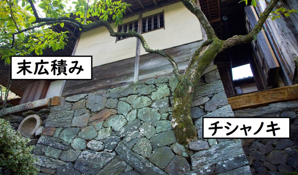 石積みの間から生えている木はチシャノキです。もともとここに生えていたものをそのまま石積みに嵌(は)め込んでいます。柿の木に似ていることから「柿の木だまし」とも言われています。