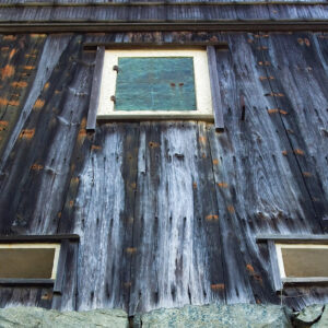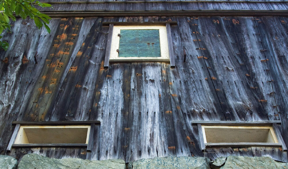 壁面にはひしぎ竹、銅、舟板、漆喰が使われています。漆喰枠の開口部に建つ扉の銅板張りが錆びることで、緑青(ろくしょう)という味のある緑色が点景となっています。舟板も年月を経た木の味わいがあり、風情を添えています。耐久性のある舟板や、水をはじく竹など実用的な面はあるものの、やはりこの建物は下から見上げられることを意識し、意匠的にこれらの材が使われています。