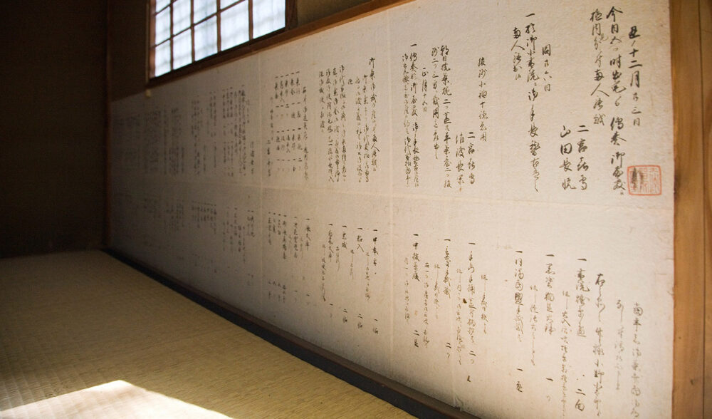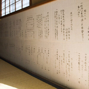 また、室内の壁の腰張には、皇室の名代を徳川家で迎えたときに、その接待役を務めた3代藩主加藤泰恒(やすつね)の「茶方(ちゃかた)日記」の反古(ほご)紙が貼られています。