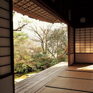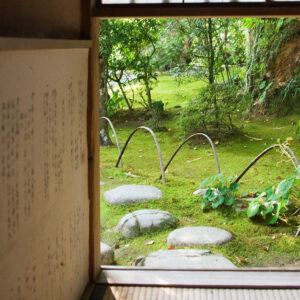 臥龍院の玄関あたる部分を迎礼の間といいます。式台の横に琵琶床のような物置台があり、三畳ほどの玄関間の取次に竹が敷いてあることで、沓脱石(くつぬぎいし)から上がった人に特殊な感触を味わわせます。