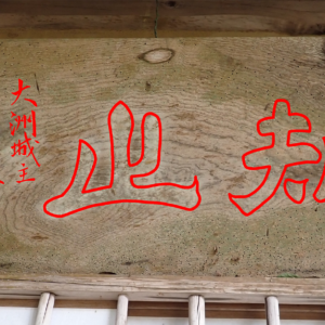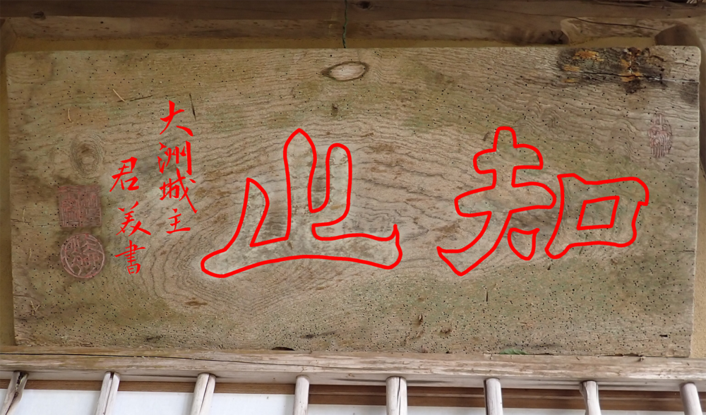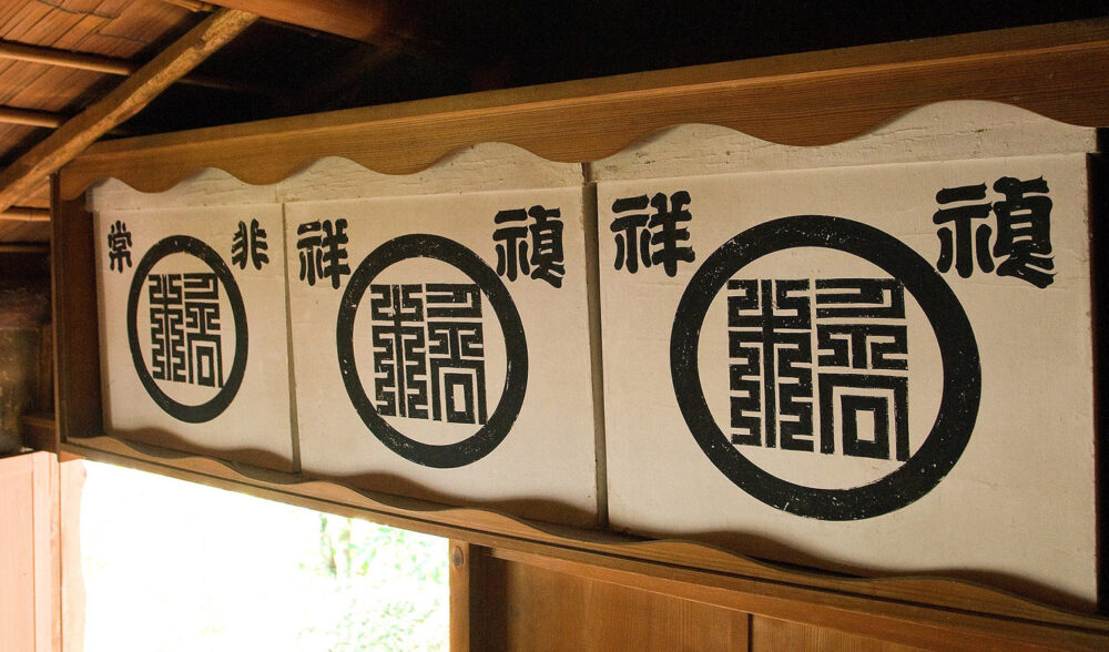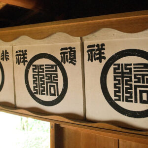 また、入口の上部には、篆刻風(てんこくふう)の文字が書かれている提灯箱(ちょうちんばこ)があり、中には家紋入りの提灯が入っています。中央と右の箱に書かれた「禎祥(ていしょう)」の字は「めでたいしるし。よい知らせ」で婚礼の意味、左の箱の「非常」の字は火事や洪水など非常時を表しています。箱の中央に書かれたマークのようなものは河内家の家紋で、伊予楠氏(なんし)の祖である橘(たちばな)氏から「橘」の字が描かれています。