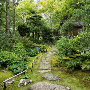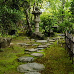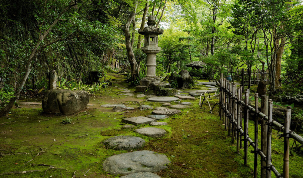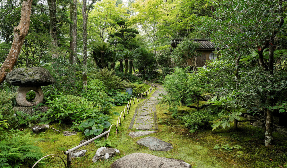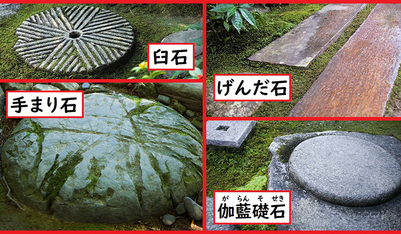 庭園内に入って特に目を引く踏み石は、手まり石、げんだ石、石臼など様々な種類の石が使われています。もともと、客人の誘導あるいは雨や湿気の多いところで足元に泥が付かないよう、また庭のコケなどを踏まないよう、実用の目的で置かれてきましたが、やがて庭を美しく見せる景観の主役としても活用されています。