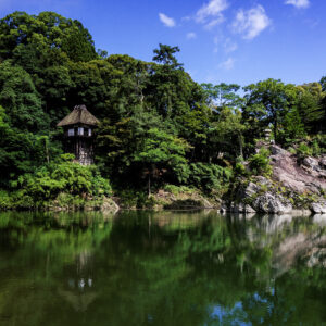 臥龍山荘の中でも最も眺めの良いところに建てられたのが不老庵です。8畳の座間は3方を開放して崖下の肱川の眺望を楽しめます。不老庵は、建物の半分以上を崖からせり出すように建てられています。この建築技法は、懸け造りと呼ばれ、京都の清水寺の舞台と同じ構造となっています。不老庵の下は肱川の中でも特に深く、龍が住んでいるとの伝説で「臥龍淵(がりゅうぶち)」と呼ばれています。その上に山荘ができたため、この建物は「臥龍山荘」と名付けられました。