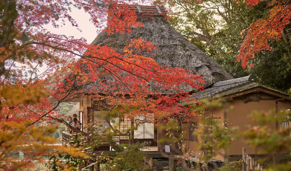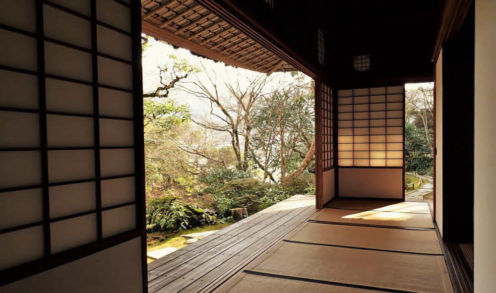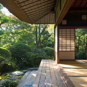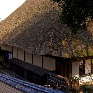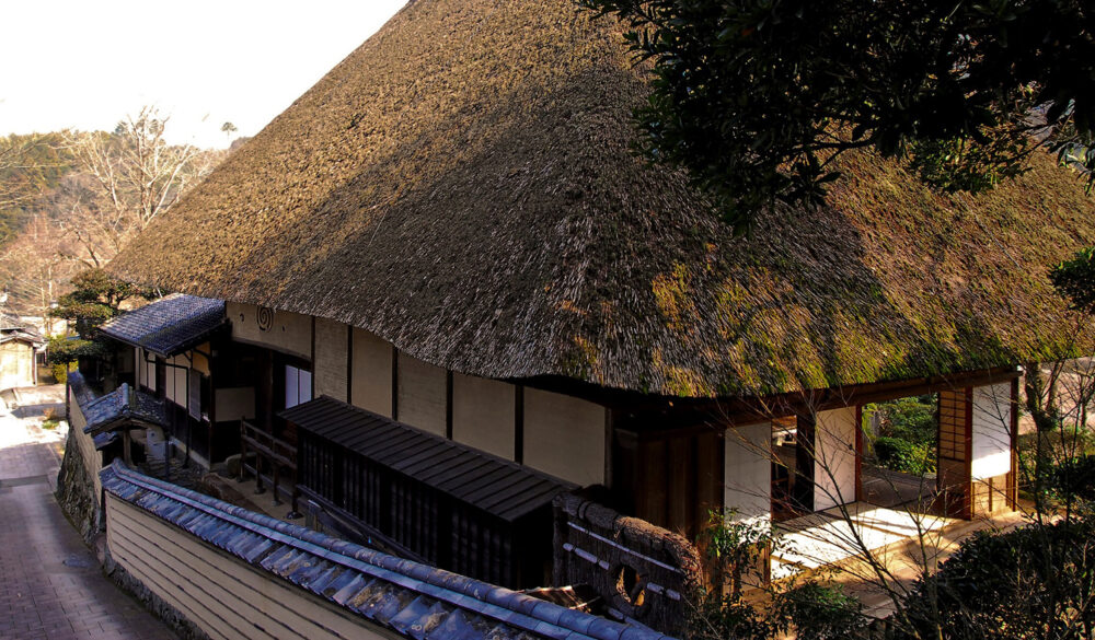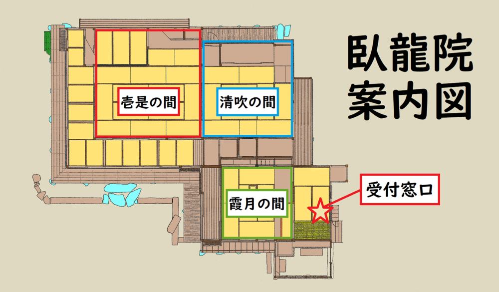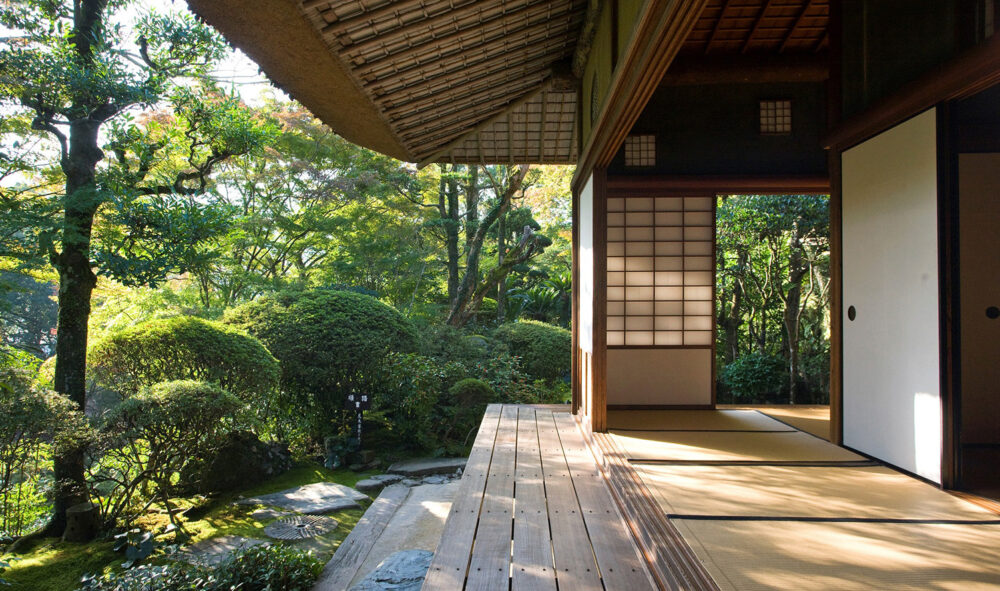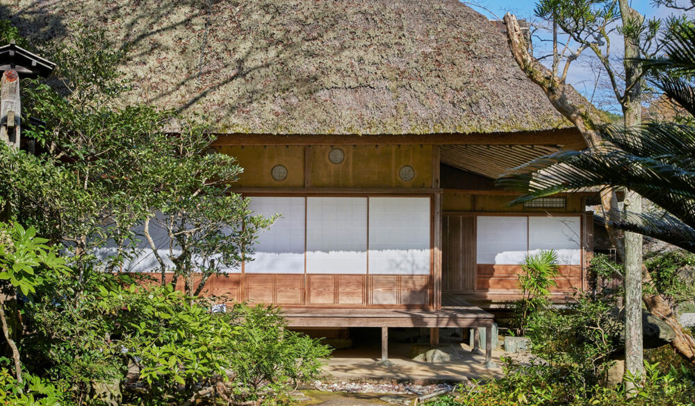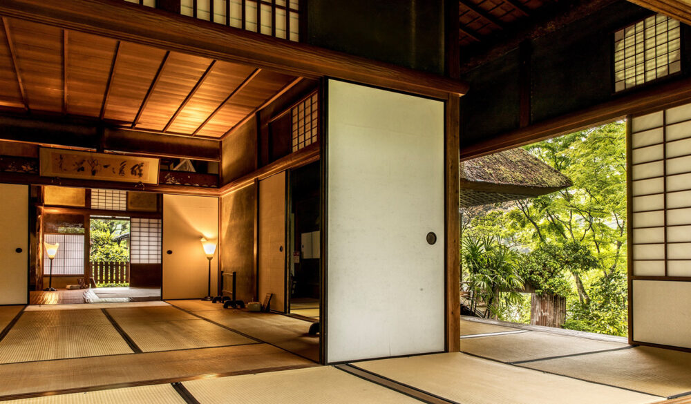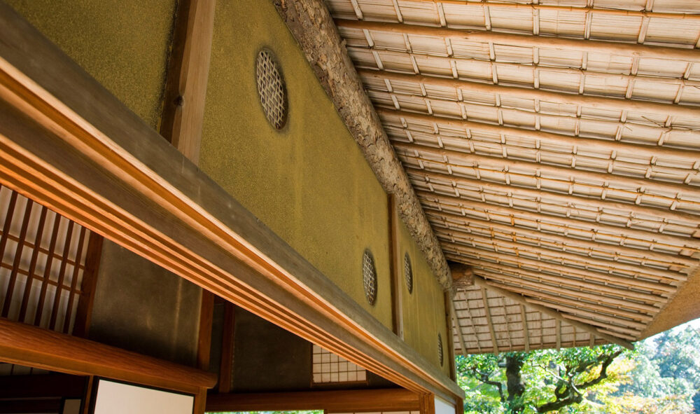 大きな茅葺(かやぶき)の屋根が特徴である建物は臥龍院と呼ばれています。一見、農家を思わせる数寄屋建築ですが、内部の各部屋には名工たちの卓越した技術が集結しています。