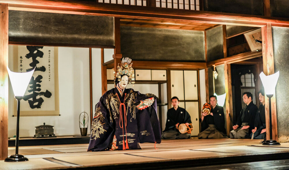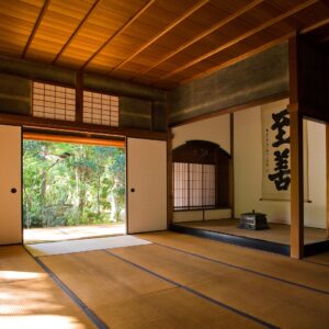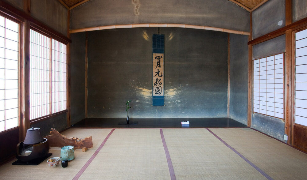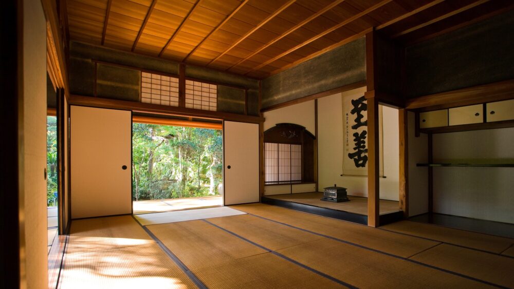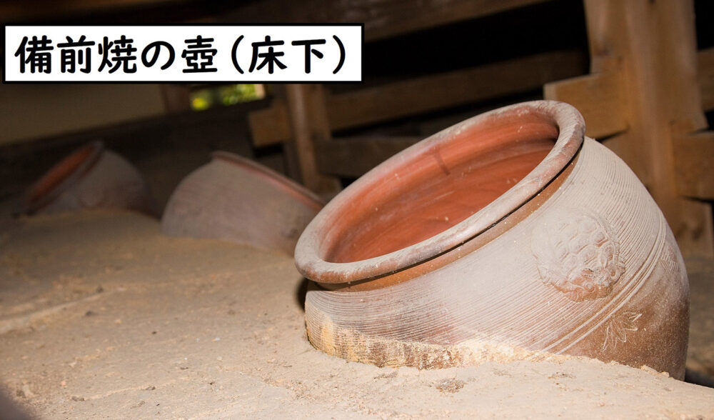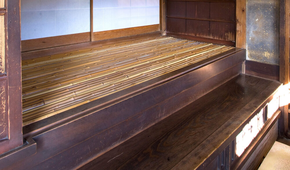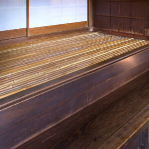 壱是の間に敷かれた畳は、臥龍山荘が建築された明治40年代に作られたものです。若いイグサを使っているため、目が細かく1日に1枚しか作ることができない貴重な畳です。この畳を上げると板の間となり能舞台に変わります。能には音響効果が必要なため、床下に備前焼の壺が四方に3個ずつ合計12個置かれてあります。