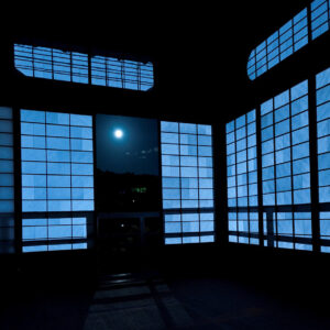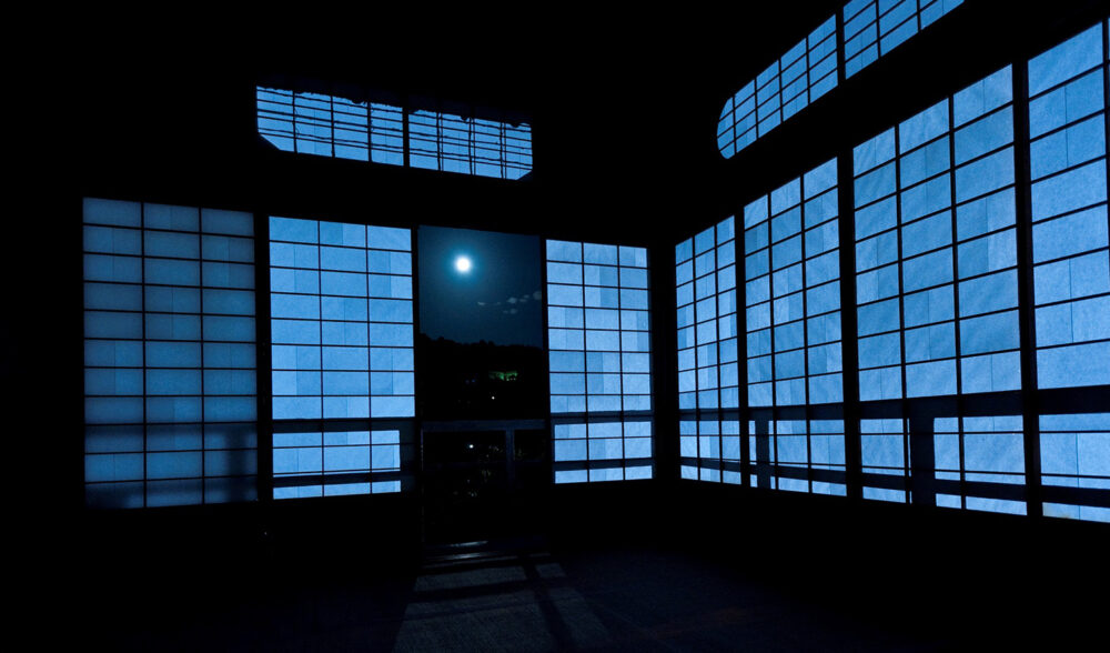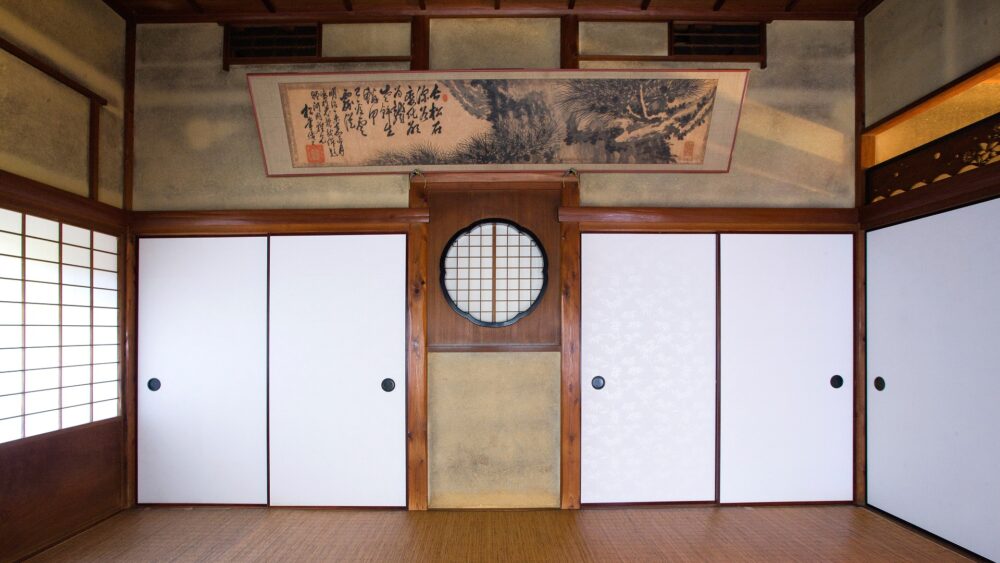 床の間にある違い棚を霞棚(かすみだな)といい、富士山の掛け軸の前に置くことで霞がかった雲を表しています。丸窓の奥は仏間になっており、蝋燭(ろうそく)に明かりがともされると月明かりのような情景になります。