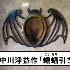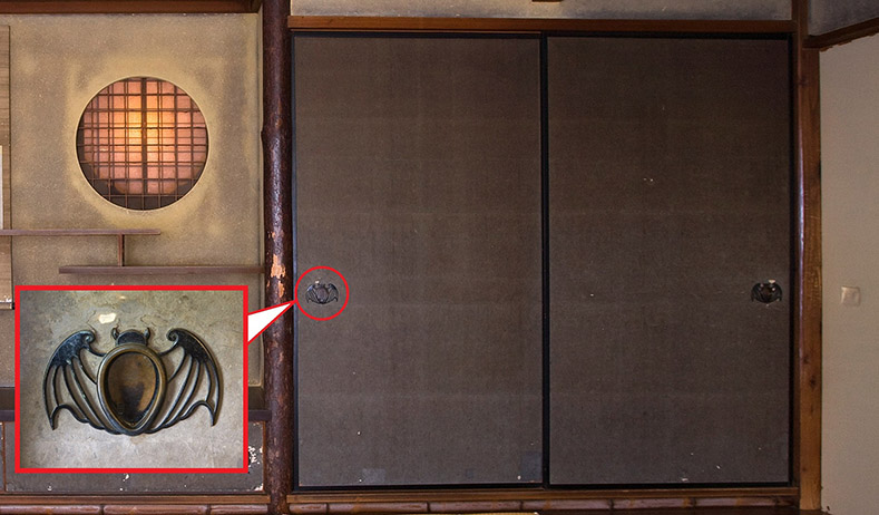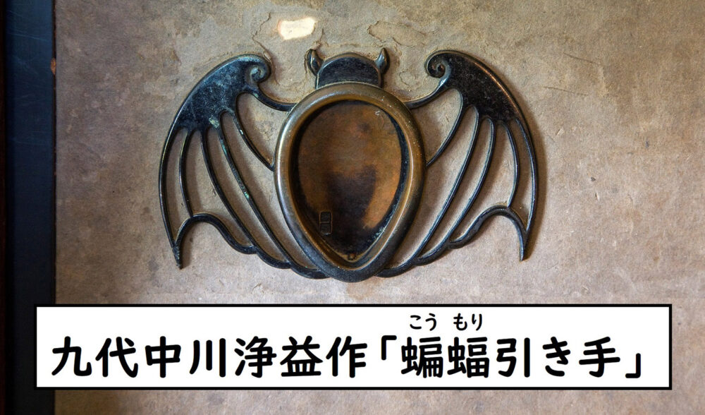 霞月の間の襖は黒くなっていますが、これは古くなって黒くなったものではありません。利休鼠(りきゅうねず)と呼ばれる渋い灰色の染め唐紙(からかみ)が使われており、夕暮れの空間を表しています。引手には、同じく夕方を表す蝙蝠(こうもり)を模した金具が使われています。この蝙蝠型の引手は、千家十職の金物師・九代中川浄益によるものです。