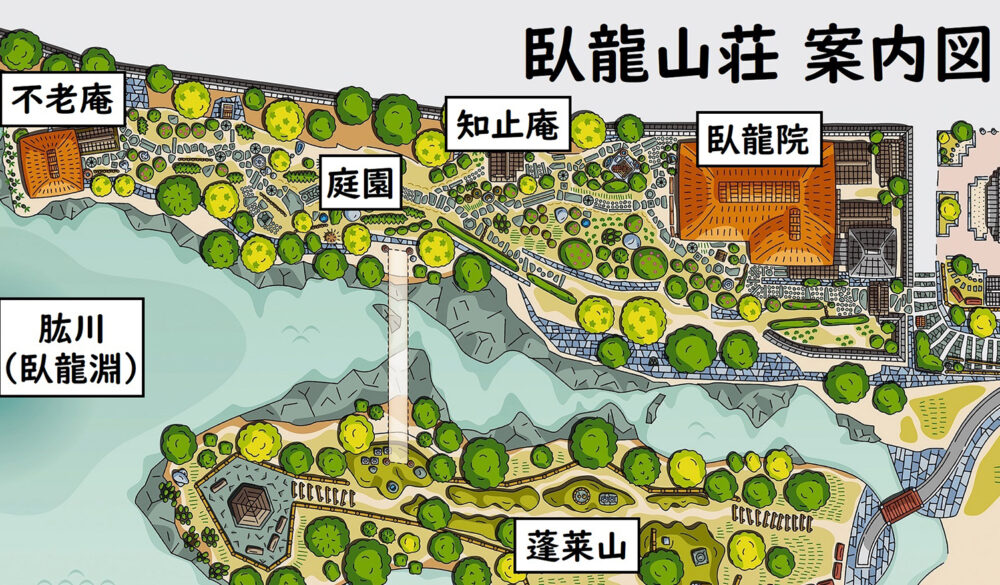 臥龍山荘は、3つの建物である臥龍院、知止庵(ちしあん)、不老庵(ふろうあん)と、国の名勝に指定された庭園から構成されています。