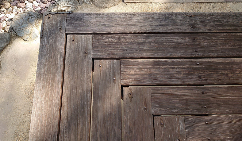 濡れ縁のうち、板の接合部分をご覧ください。一見すると、ただ切り落とした板を配置したように見えますが、実は切り落とした部分の木目が見えないように、北側の板を1ミリ程度、先端部分まで伸ばしています。
