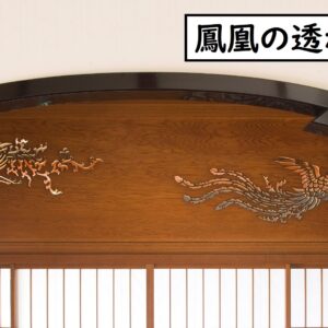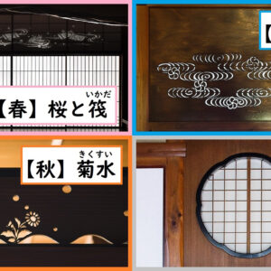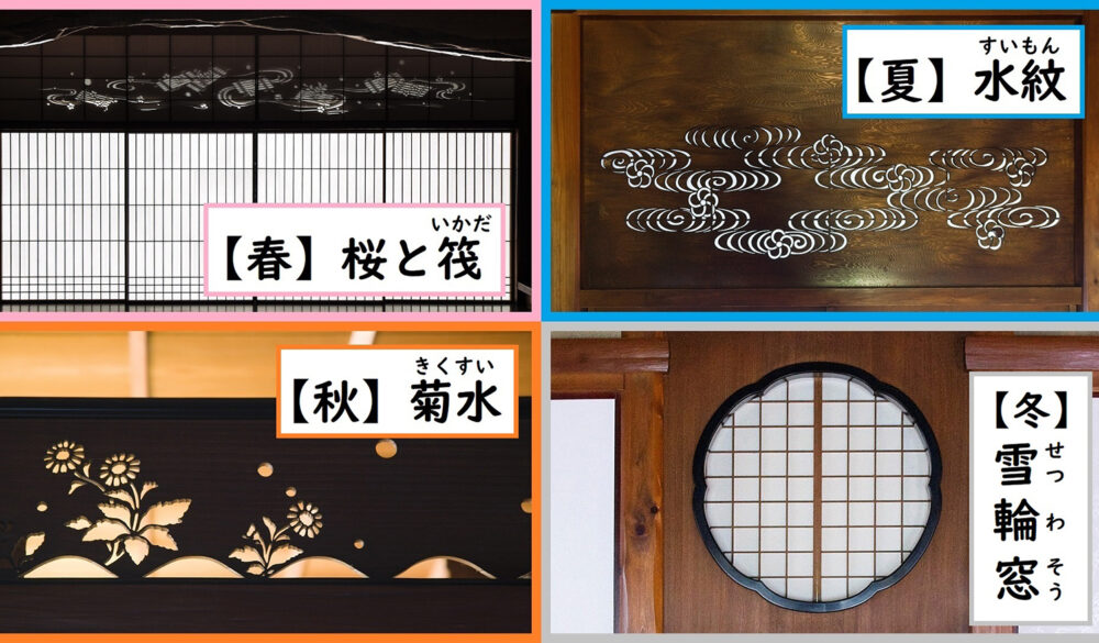 清吹の間には、水にちなんだ四季を表現した彫刻があります。正面の神棚の下の欄間(らんま)には「桜と筏(いかだ)」で春、中庭に面した欄間には「水(すい)紋(もん)」で夏、左側の壱是の間との間の欄間には「菊水(きくすい)」で秋、仏間との間の「雪輪窓(せつわそう)」で冬をそれぞれ表しています。いずれも、千家十職の指物師・十三代駒沢利斎(こまざわりさい)による見事な透かし彫りです。