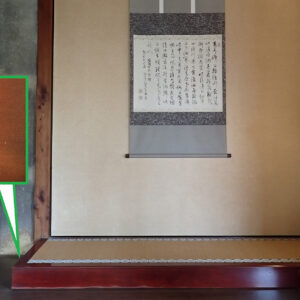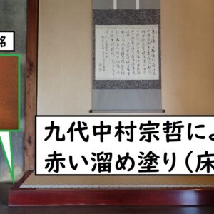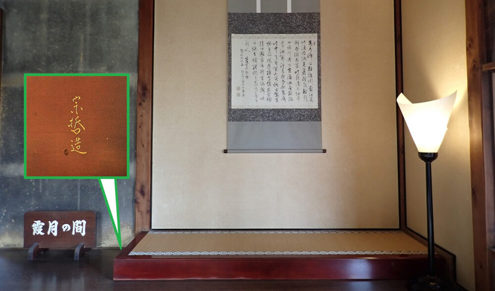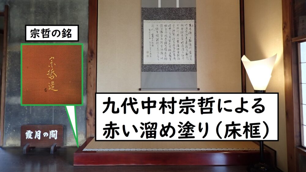 また、霞月の間には、床柱を省いた置き床と呼ばれる床の間もあります。床框(とこかまち)は、千家十職の塗り師・九代中村宗哲の「ため塗り」によるものです。側面には宗哲の銘が彫られています。