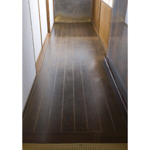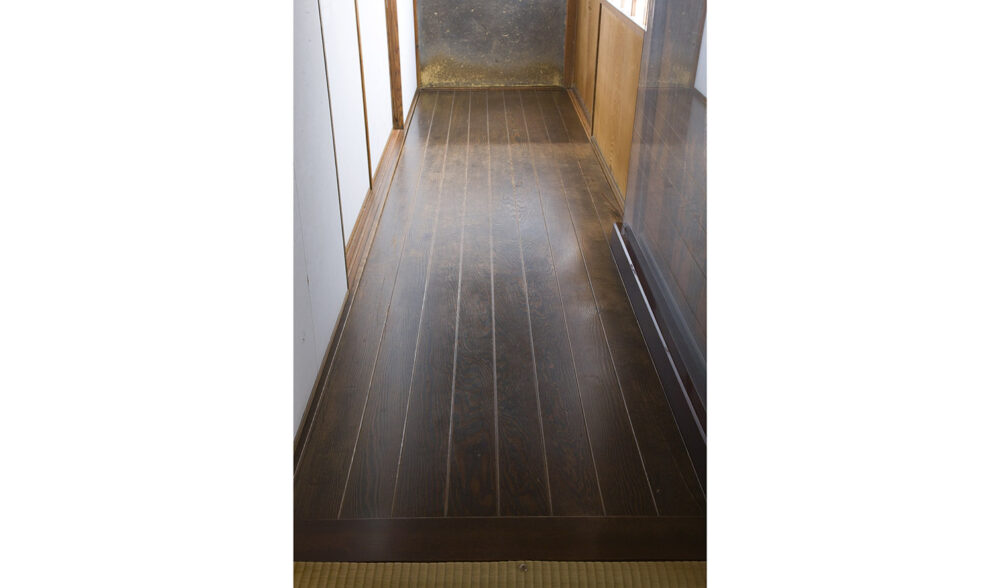 縁側の廊下には、幅三尺、長さ二間の仙台松の一枚板が使われています。寄せ木のごとく溝が彫ってありますが、よく見ると木目がきちんと揃っています。