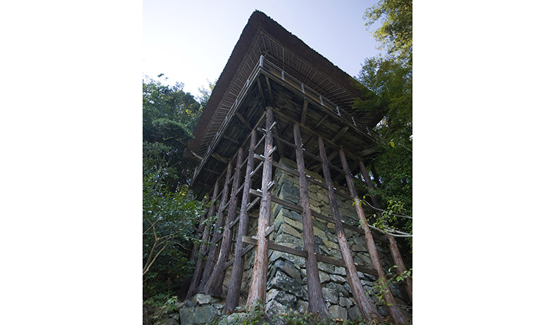 不老庵は建物の半分が崖から出ており、懸け造りの技法を用いて、7メートルあまり下の地面から束柱(つかばしら)で支えられています。愛媛県に現存する懸け造りの建物はこの不老庵も含めて3つありますが、いずれも大洲市内にあります。