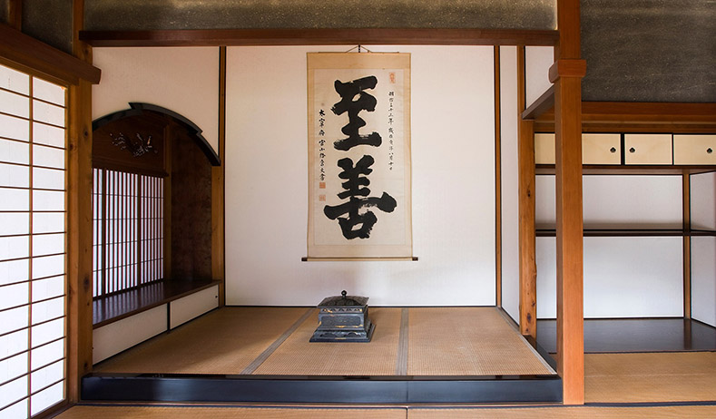 床に掛けられている「至善」の軸は、「天子(てんし)より以(もつ)て庶人(しょじん)に至(いた)るまで壱是(いっし)みな修身(しゅうしん)を以て本(もと)と為す」(天子から平民まで、皆まず自分の言動を正しくすることがもとである)という陽明学の本義を表したものです。