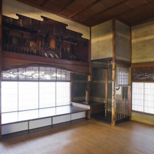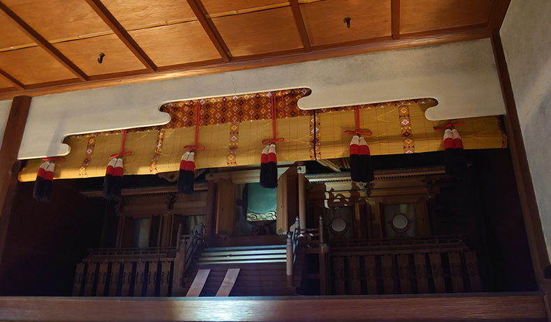 清吹の間には、非常に大きな神棚が祀(まつ)られています。臥龍山荘を造った河内寅次郎は、神楽を毎年奉納するほど神様を大事にしており、商売人として商売繁盛を願って作ったのでないかと言われています。清吹の間の天井が他の部屋と比べて高いのは、最初からこの部屋に神棚を祀ろうと構想していたからとも言われています。神棚には、中央に皇大神宮(こうたいじんぐう)、両側に地方の郷社である八幡神社(はちまんじんじゃ)、大洲神社などの神殿が納められています。