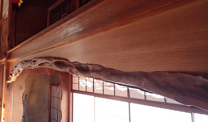 神棚を支えているのは、皮付きの「一位(いちい)の木」による山形の落とし掛けで見事なナグリに仕上げられています。ナグリとは手斧(ちょうな)ではつり目と呼ばれる削り目を残した仕上げを入れたものであり、素朴さを表現するものとして、よく茶室に使われています。