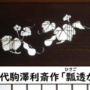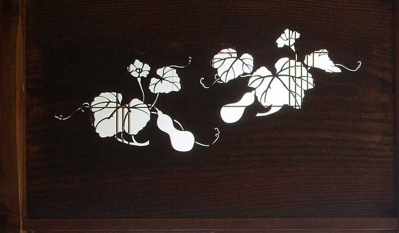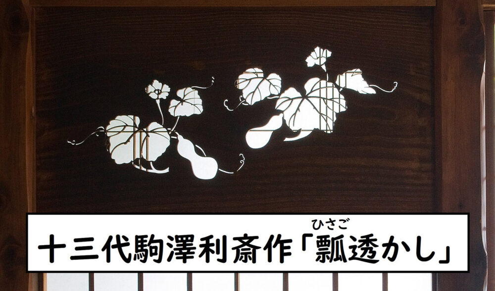置き床の右手にある平書院欄間には、千家十職の指物師・十三代駒澤利斎(こまざわりさい)作の瓢箪(ひょうたん)の透かし彫り「瓢透(ひさごす)かし」があります。瓢箪の花は、夕顔と同じく夕暮れに花を咲かせることから、部屋全体の意匠を夕暮れに統一したものと言われています。