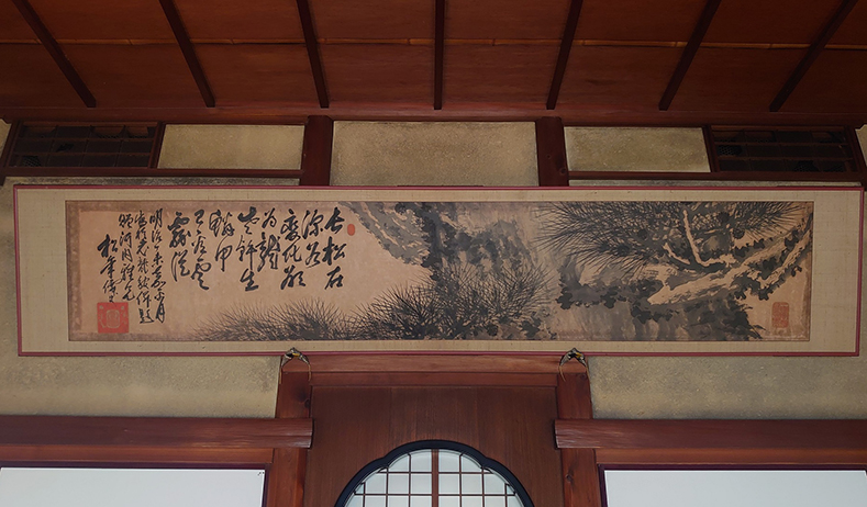 清吹の間に飾れられている横長の絵は、鈴木松年(すずきしょうねん)による作品「老龍の画」です。臥龍山荘の完成祝として河内寅次郎に寄付されました。水墨で力強い老松を描き、その陰影を生かして老龍を想起させるたくましさが表現されています。