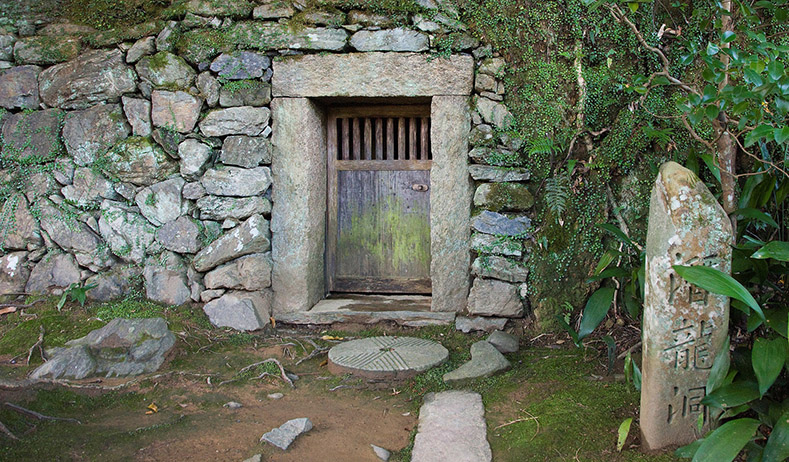 庭園内の洞穴は、氷室(ひむろ)として使われていました。氷室は現代でいうところの冷蔵庫のようなものです。伝説によると、近くの臥龍淵と呼ばれる川の淵に龍が住んでおり。その龍がお昼寝に入っていたという話から、ここは潜龍洞と呼ばれています。
