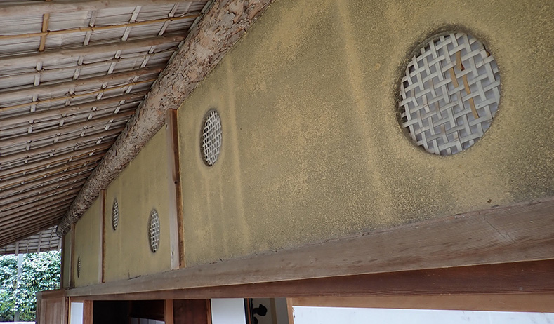廊下の上の下地窓は、桂離宮のものは横一線に6個の同じ丸窓が並べてありますが、ここでは5個の小さな丸窓と2個の大きな丸窓を、バランスをとるために上下にちらしてあります。