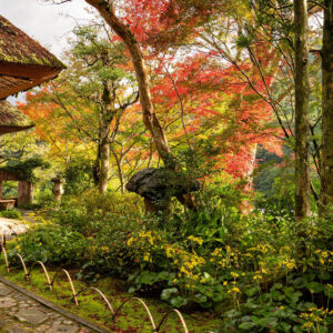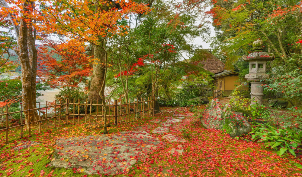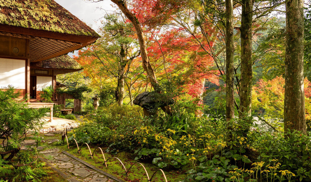 庭園には、コケが多く、カエデ、エノキ、サルスベリなどの数百年前の木々があります。また、縁起のよいものも多く植えられており、赤や黄の実が成るマンリョウ、センリョウ、ジュウリョウは、商売繁盛と末永い家の繁栄を願って植えたものだとも言われています。