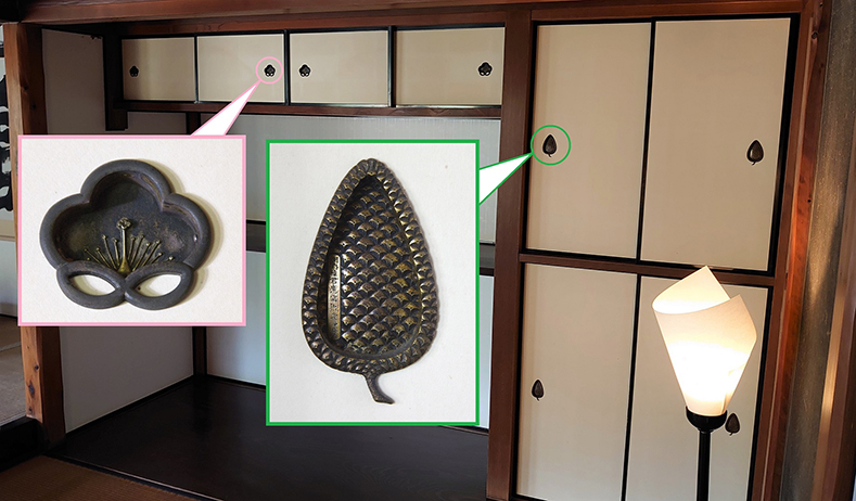 床の間の右手にある床脇には、縁起の良い松竹梅が隠されています。横長の襖の引き手に梅の花、田の字の襖の引き手に松ぼっくり、白い壁には竹の模様と、格調高い部屋を表しています。